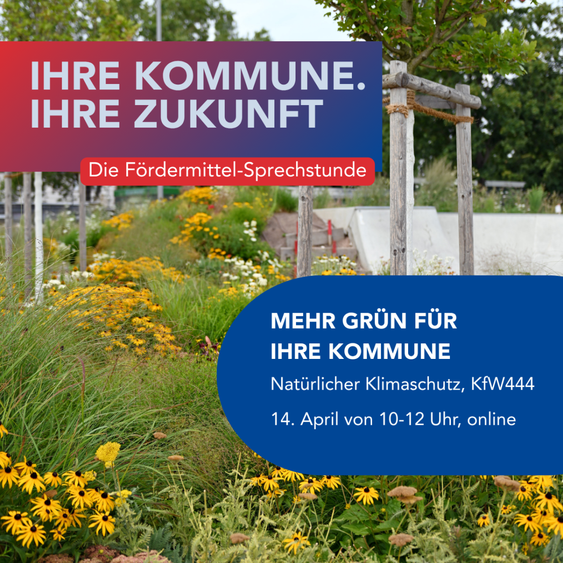 Sie möchten Flächen entsiegeln und begrünen, kurzum Naturoasen in Ihrer Kommune schaffen? Dann nehmen Sie an unserer nächsten Online-Fördermittel-Sprechstunde für Kommunen teil! Die Teams des Hessischen Regionalbüros für Natürlichen Klimaschutz sowie der LEA Hessen beraten zu KfW 444 und weiteren Fördermöglichkeiten.